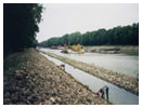 Nach der Verklammerung der Schüttsteine wurden die übrigen Hohlräume mit einem fließfähigem Oberbodengemisch aufgefüllt. Durch diese zusätzliche Substratanreicherung des Deckwerks wurde die flächige Ausbreitung der Pflanzen positiv beeinflusst. Die eingesetzten Vegetationsbulte gewährleisten die gewünschte Standsicherheit in diesem Schüttsteindeckwerk.