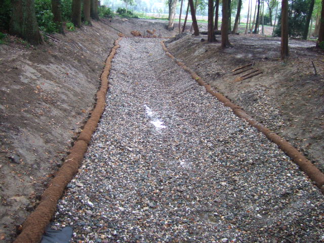 Lehmhaltiger Boden diente dabei zur Stabilisierung bei der Böschungsprofilierung. Im Sohlbereich wurde Kies der Größe 0 – 2 mm eingebaut.