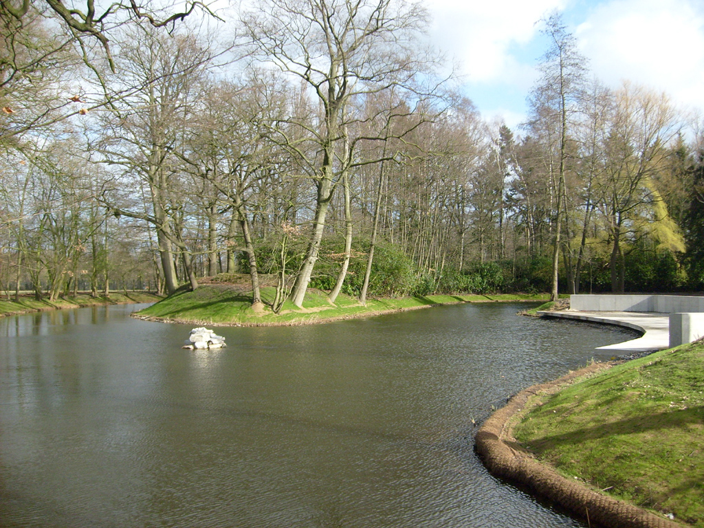Bei dieser Baumaßnahme lag die besondere Herausforderung darin, die verschiedensten Ansprüche des Kunden miteinander zu vereinen.Aufgrund der Gegebenheiten war zunächst die Rodung von Baumbestand erforderlich. Anschließend musste der über Jahrzehnte entstandene Schlamm aus den Grachten entfernt werden, um von der Sohle beginnend einen stabilen Böschungsaufbau durchführen zu können.