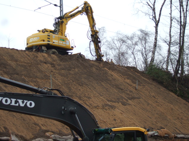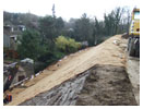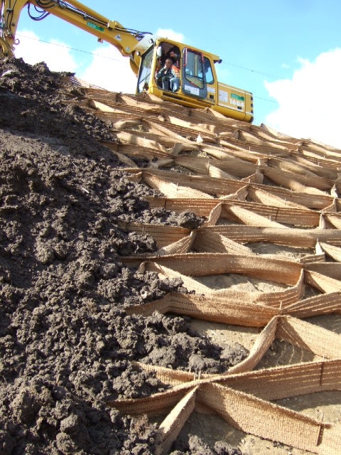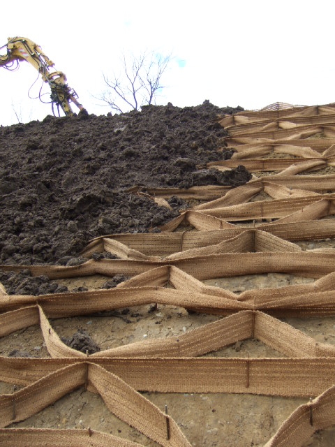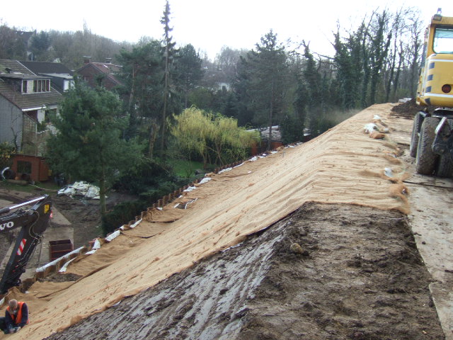 Nach der abschließenden Profilierung der Böschung wurde ergänzend noch eine Erosionsschutz-matte bestehend aus Kokosfasern mit eingearbeitetem Saatgut verlegt.