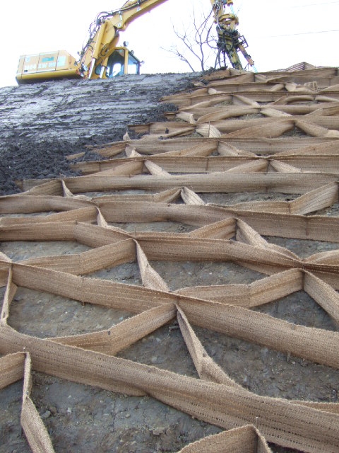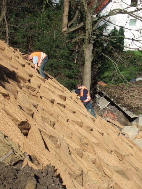 Wir empfahlen daher den Einsatz unseres Kokosböschungsbandes. Die Befestigung erfolgte mittels Torstahlhaften. Verlegt wurde das Band in Rautenform, wobei zusätzlich noch jeweils ein Band mittig eingebracht wurde.